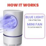 β€’ UV LEDs and photocatalyst attract mosquitoes; the built-in fan creates airflow that traps them in the bottom box